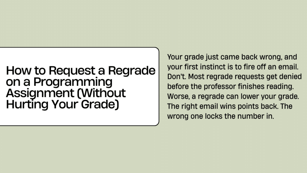 Most regrade requests land within 72 hours of the grade being posted, and the ones that land later face steeper resistance. Professor memory of the assignment fades fast once the next lecture starts. TAs move on to the next grading batch. The grading context that made the original mark clear disappears, and cold grading favors the original grader. Missing a regrade window feels similar to missing a submission. What Happens When You Miss a Programming Assignment Deadline? covers the broader consequences of timing failures in CS courses.