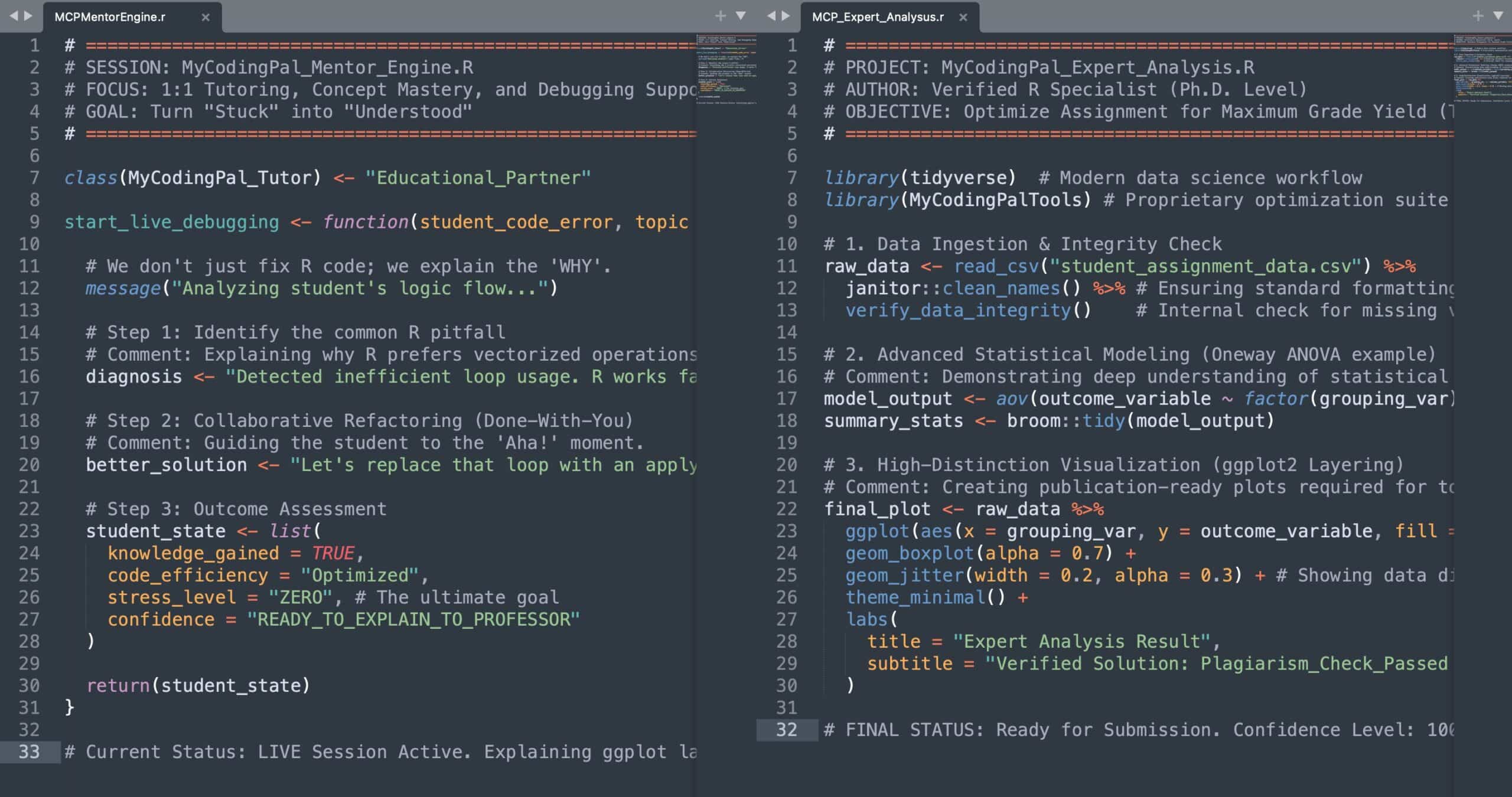 When you contact MyCodingPal to get R programming assignment help, you can be assured that seasoned pros will be working on your R homework assignments or project. MyCodingPal experts give their 100% and then some more to get you the perfect solution. You don’t have to worry about your grade/score once you sign up with us. Ensuring a good grade for you is our job.